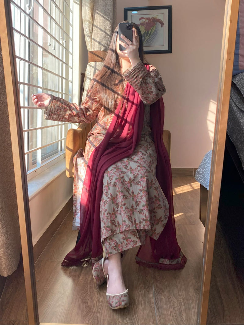 A soft earthy outfit with delicate red floral prints and lace-detailed sleeves. Paired with a rich maroon dupatta, Gulnaar brings effortless elegance to your festive or daytime looks.