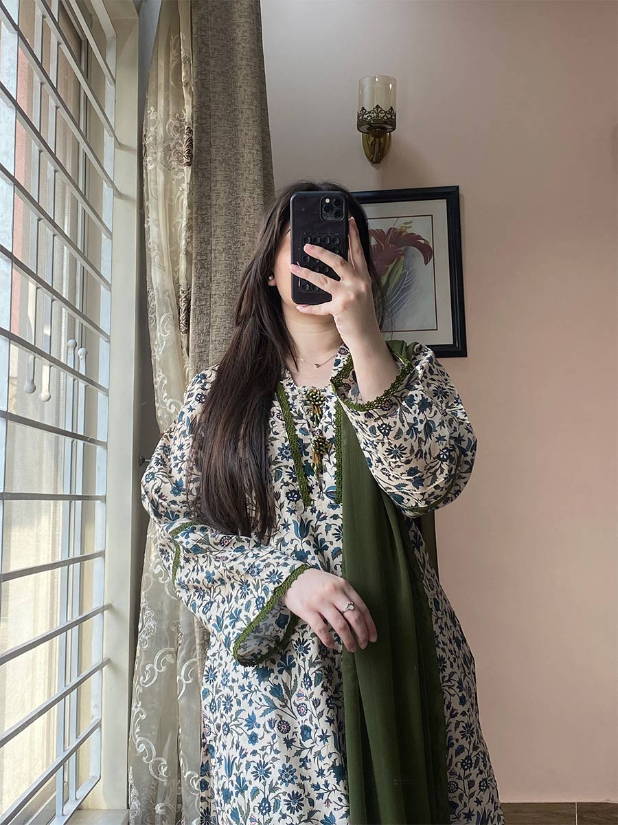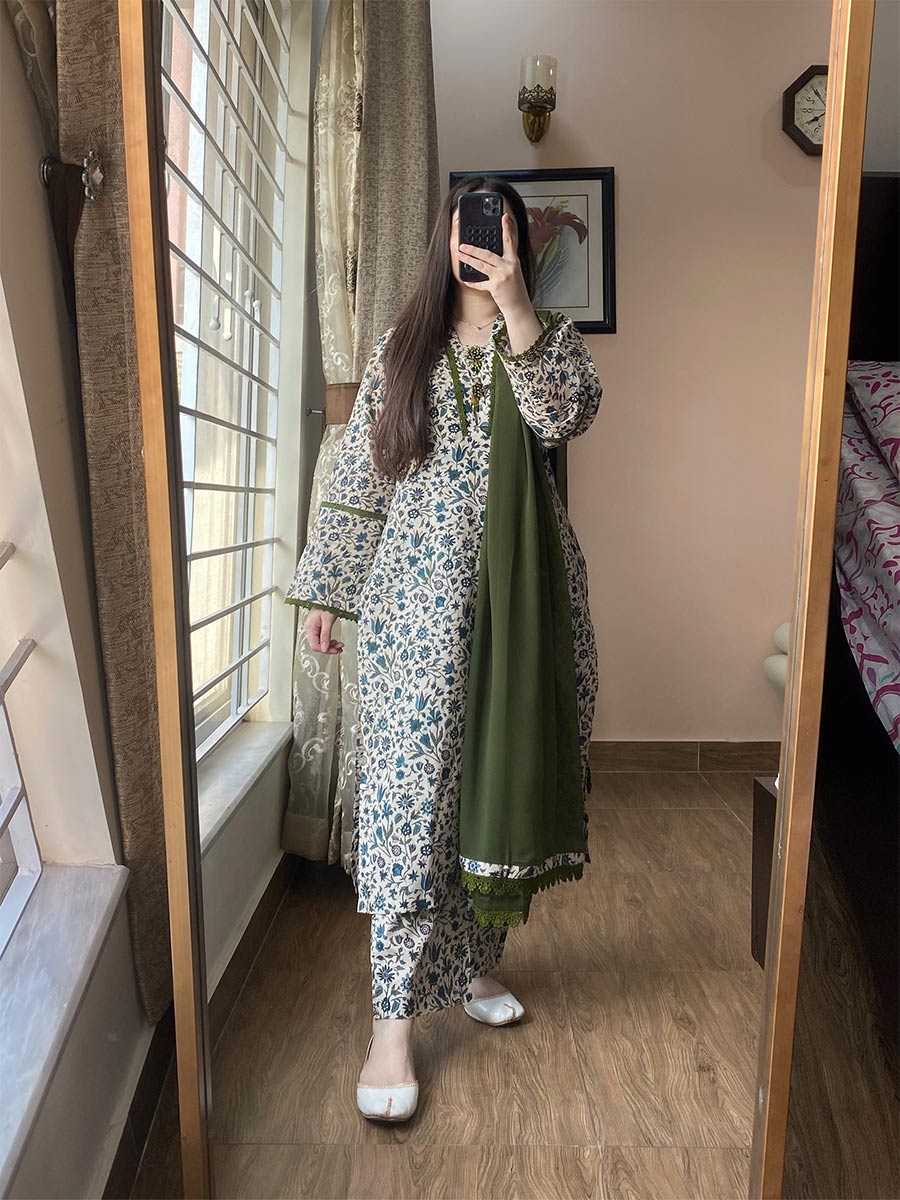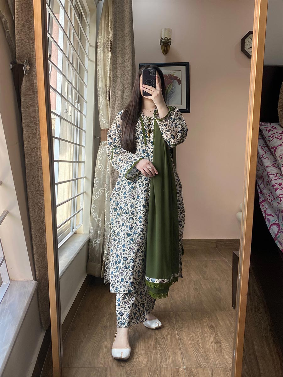 Graceful 3-Piece Printed Ensemble featuring a refreshing ivory base with intricate blue botanical patterns for a soft, timeless look. Accentuated with lace detailing on the neckline and sleeves, and paired with a deep green dupatta trimmed with lace—perfect for elevating your everyday style or casual gatherings.