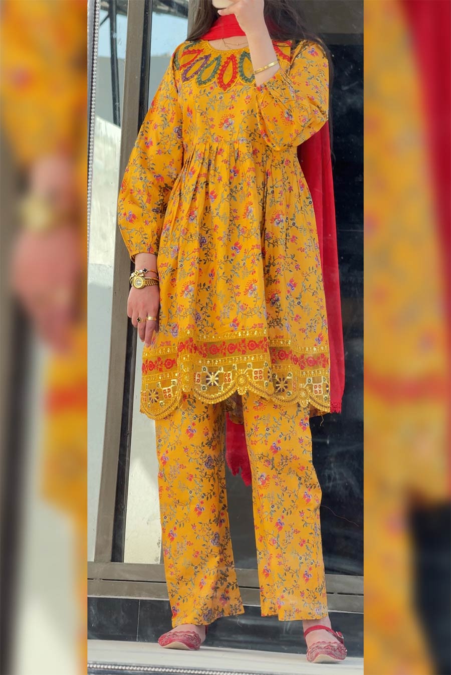Feature: Paired with Trouser, Embroidered Neck and Flare, Dupatta with Lace Detailing