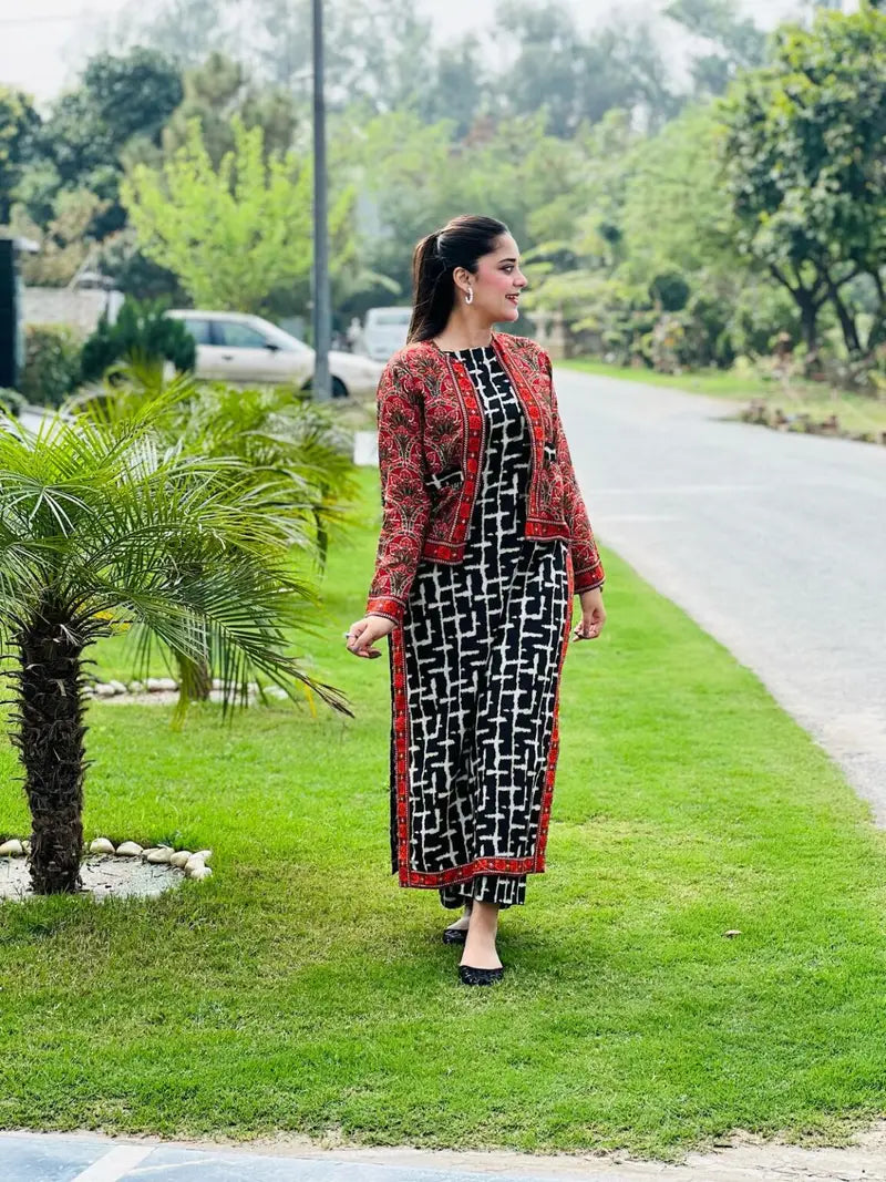Description: This elegant 3-piece stitched suit features a stylish geometric print shirt, a beautifull koti (jacket), and a matching trouser. Perfect for casual and semi-formal occasions, offering both comfort and sophistication. Order now to elevate your wardrobe!