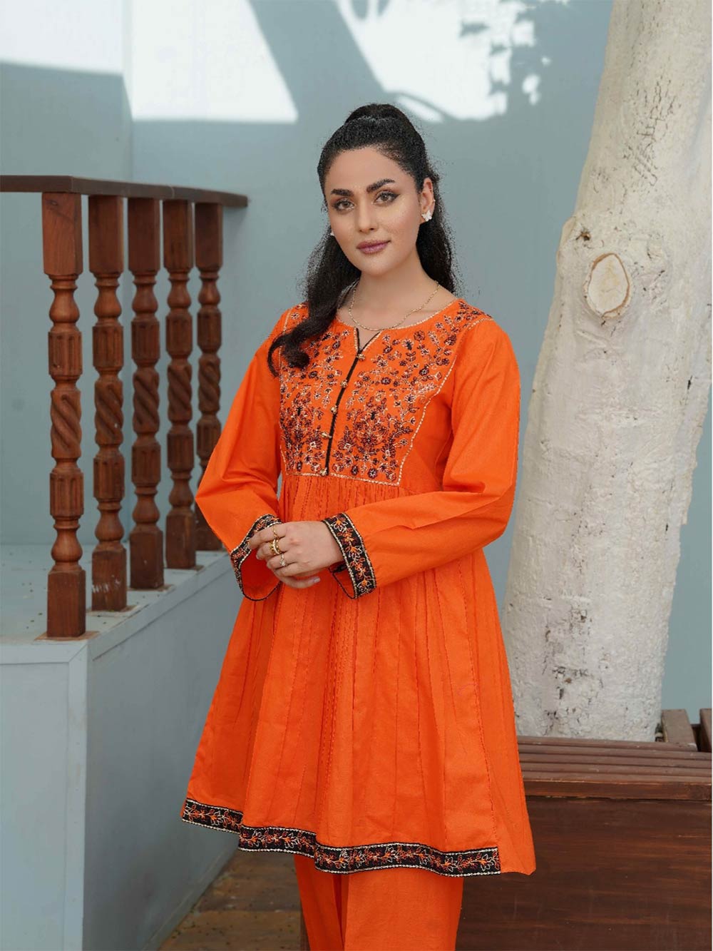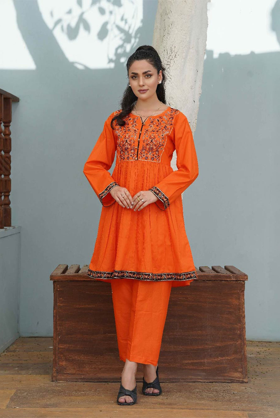 Details: Thread and Tilla Embroidered Stitched Suit Paired with Bell Bottoms